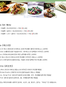 반응형 Menu3 Set Menu(셋메뉴)점심특선 Set Menu(셋메뉴) 점심특선 2023. 11. 30. Tea & Beverage Tea & Beverage Coffee┃커피 Espresso┃에스포레소 ┃5,000 Americano┃아메리카노 ┃5,000 Cappuccino┃카푸치노 ┃5,000 Cafe latte┃카페라떼 ┃5,000 Ice Americano┃아이스 아메리카노 ┃5,000 Ice Cappuccino┃아이스 카푸치노 ┃5,000 Ice Cafe latte┃아이스 카페라떼 ┃5,000 ------------------------------------------------------------------------------------------------- Coffee & Waffle┃커피와 와플 Coffee & Waffle┃커피와 와플 ┃8,000 --------------------------------------.. 2023. 11. 30. Food Soups┃스프 Specially Prepared Soup of The Day┃5,000 오늘의 특선 단호박 크림스프 ------------------------------------------------------------------------------------------------------------------- Salads┃샐러드 Insalata Di Mare┃마레샐러드┃12,000 오렌지 드레싱과 레몬즙으로 맛을 낸 해산물 샐러드 Chicken Saiad┃치킨샐러드┃12,000 담백한 닭 가슴살을 양념하여 노릇노릇하게 구워 올린 샐러드 Garden Saiad┃가든샐러드┃12,000 키위드레싱으로 야채와 과일의 신선한 맛을 더욱 느낄 수 있는 샐러드 Cajun Saiad┃케이준샐러드┃12,0.. 2023. 11. 30. 이전 1 다음